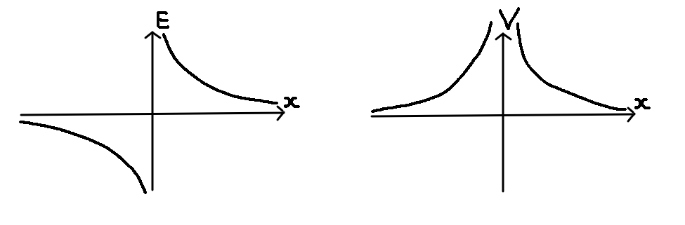 Note that these are the directions of $E$ and $V$ for a point charge $+q$ at the origin. For the $E$ field, positive $E$ indicates that another positive point charge will travel in the $+x$ direction and vice versa, away from the origin. For the $V$ field, you can imagine that another positive point charge will “follow gravity” in the graph and go as low as possible, which is away from the origin.