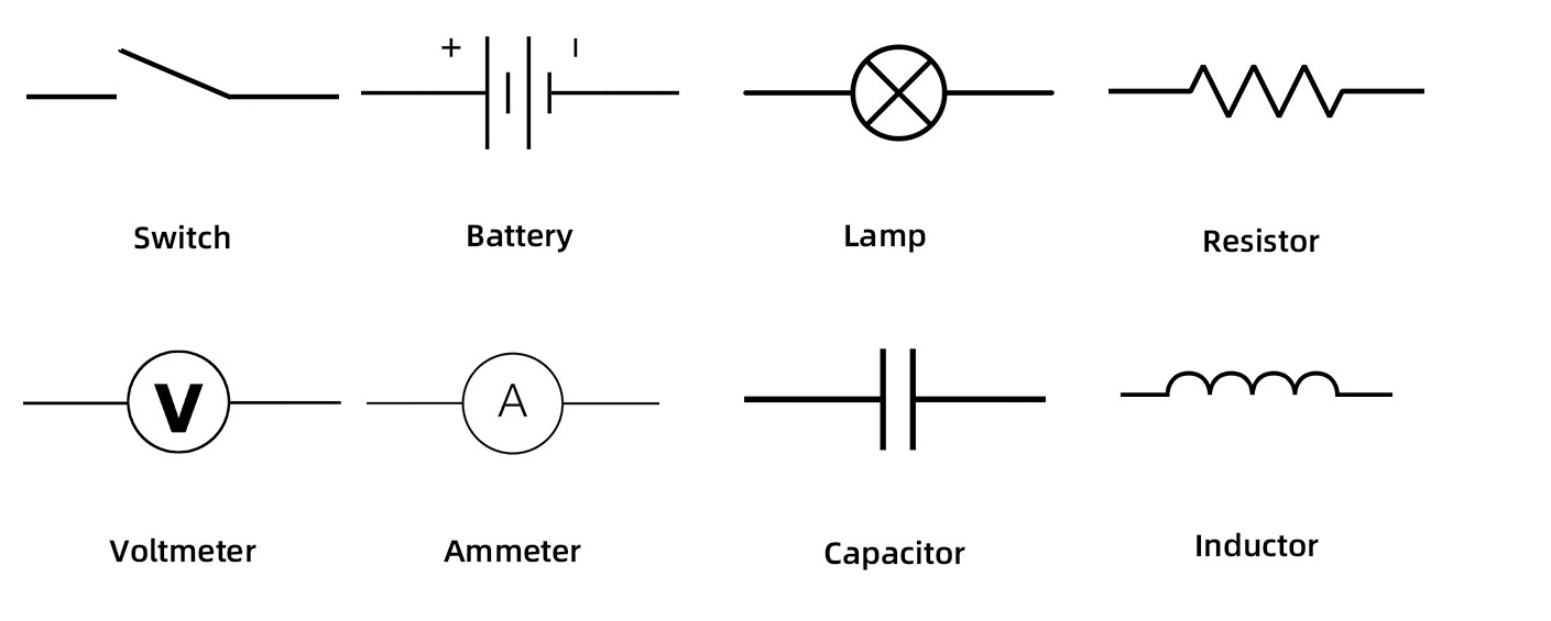 - $R = \frac{V}{I} = \frac{\rho L}{A}$, the resistance of a component, where $\rho$ is the intrinsic resistivity of a material.