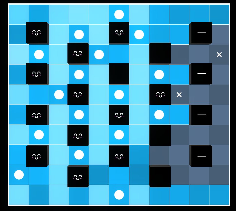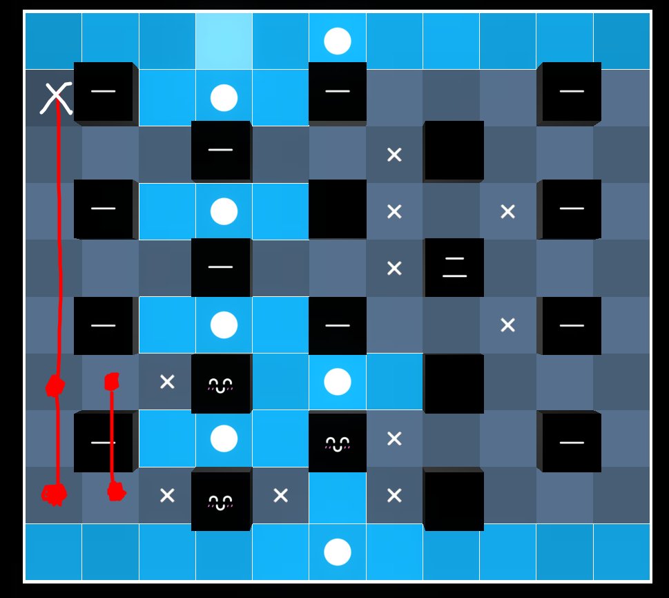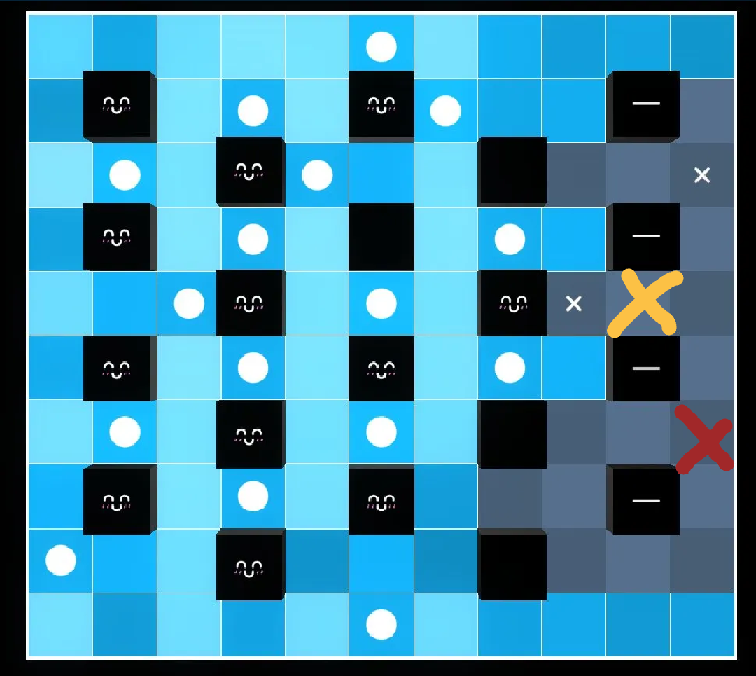We can also deduce that there are no akaris on $(7,6)$ and $(9,9)$ since they intersect a line without increasing any relavant block values.